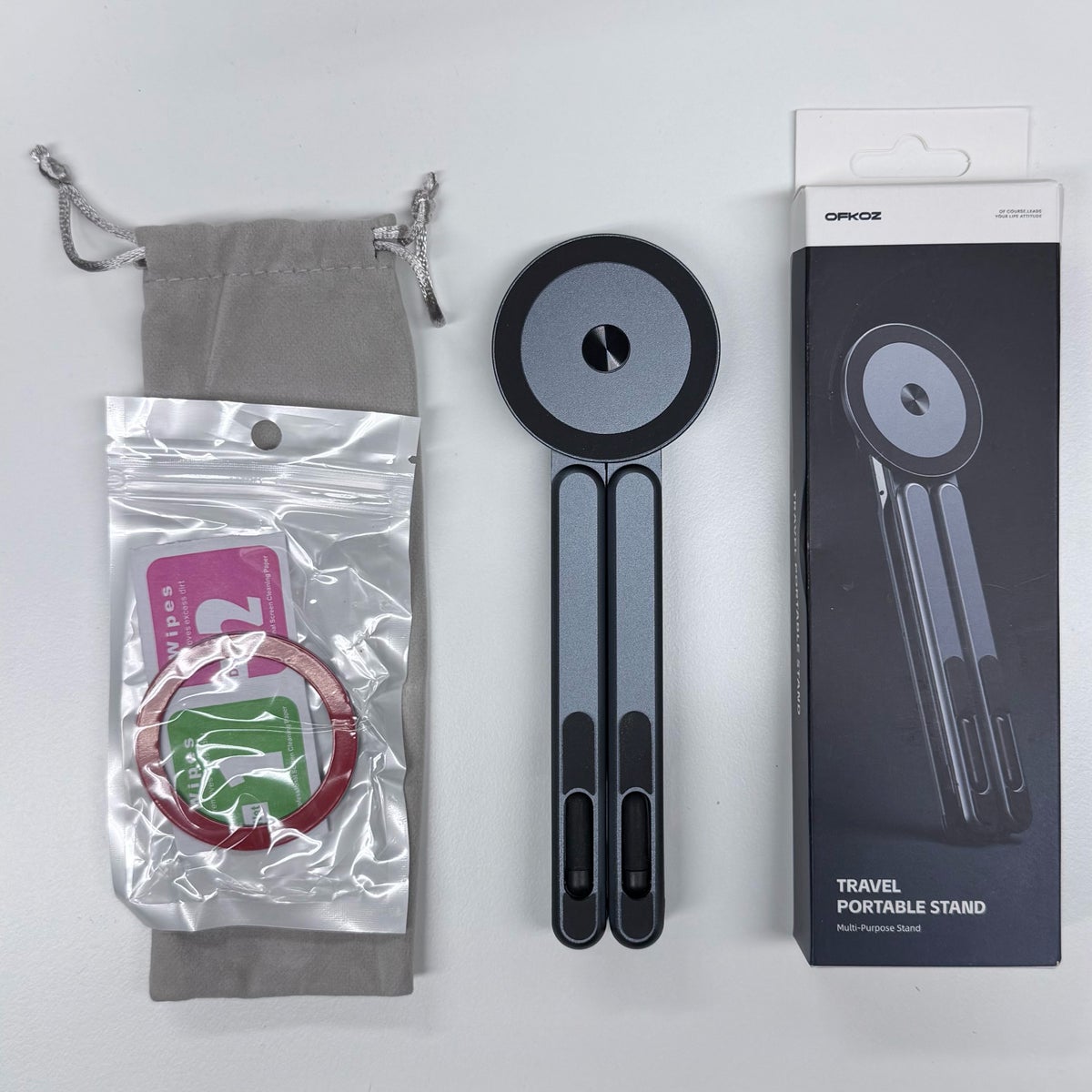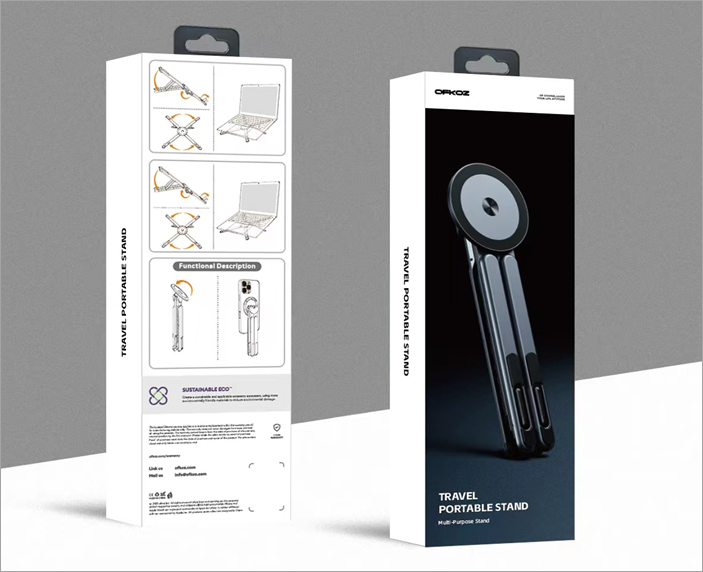 OFKOZ Travel Portable Stand on kokoontaitettava monitoimiteline, joka sopii matkalle, toimistoon ja kotiin. Sisäänrakennettu magneetti mahdollistaa nopean kiinnityksen MagSafe-yhteensopiviin iPhoneihin, ja mukana toimitettavan metallirenkaan ansiosta teline toimii myös EI-MagSafe-puhelimien kanssa.