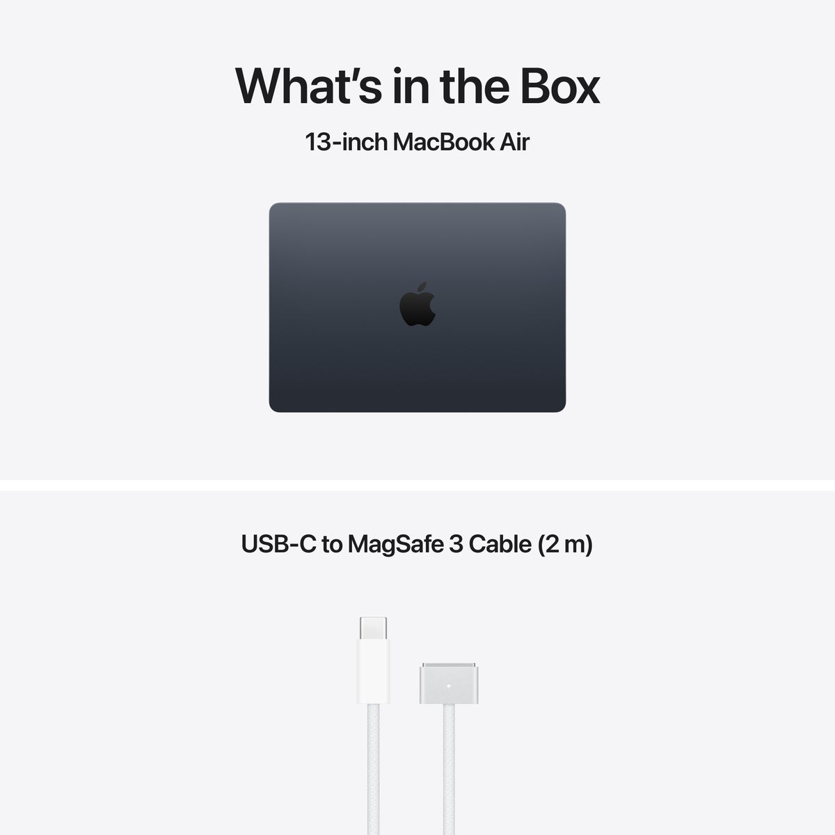 VIRTALÄHTEET – Huomio: 13 tuuman MacBook Airin mukana tulee USB C–MagSafe 3 -latausjohto, mutta ei virtalähdettä. Tämän laitteen lataaminen edellyttää USB C-virtalähdettä tai muuta USB PD -virtalähdettä, joka voi tarjota 30 W tai enemmän virtaa. Optimaalista lataamista varten Apple suosittelee, että tähän Maciin liitetään Applen 30 W USB C-virtalähde tai 70 W USB C-virtalähde. Näin voidaan hyödyntää pikalatausta (jopa 50 % lataus 30 minuutissa).5
